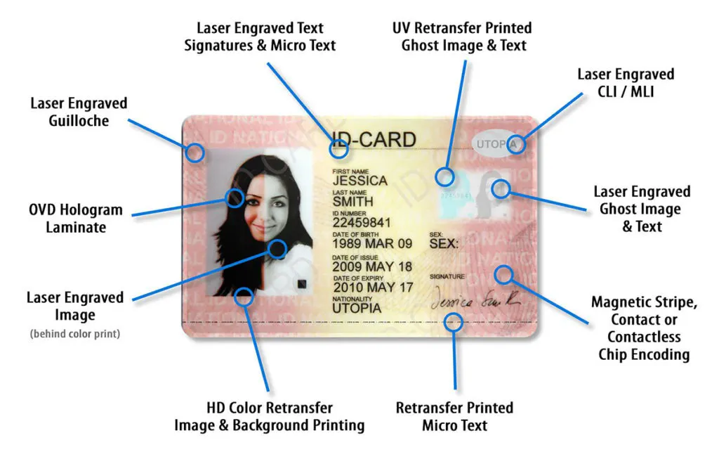 La impresión UV por sublimación de tinta (256 gradaciones) también mejora la seguridad de las tarjetas de identificación. La cara impresa UV se expone a la luz ultravioleta.