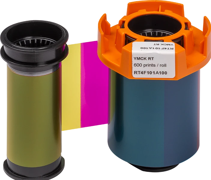 Consta de paneles amarillo (Y), magenta (M), cian (C) y negro (K), lo que permite imprimir imágenes a todo color combinadas (Y, M, C), texto monocromático o códigos de barras (K). El panel K es de resina negra.